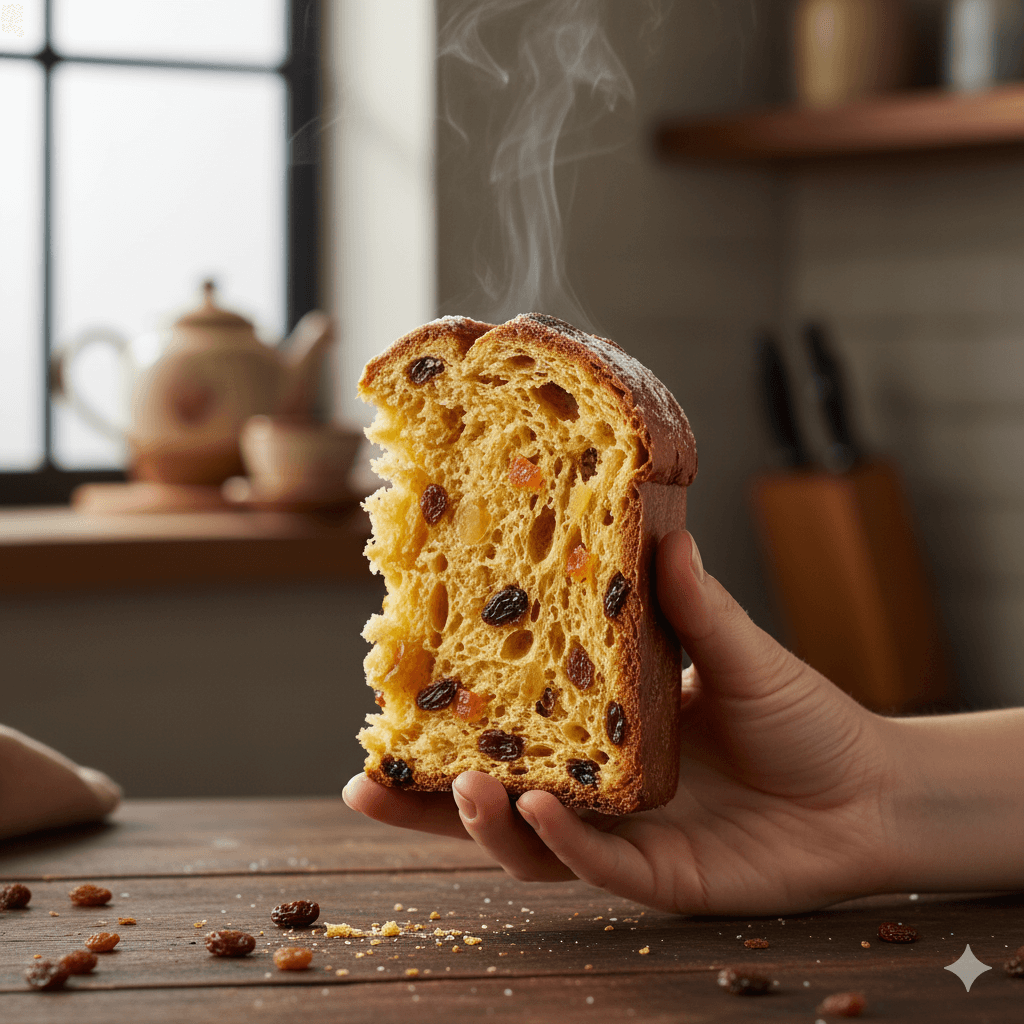 El pan dulce italiano con frutas y aroma cítrico. Su masa esponjosa, con pasas y ralladura de naranja, es un ícono de la Navidad. Perfecto para disfrutar con un café o un rompope.