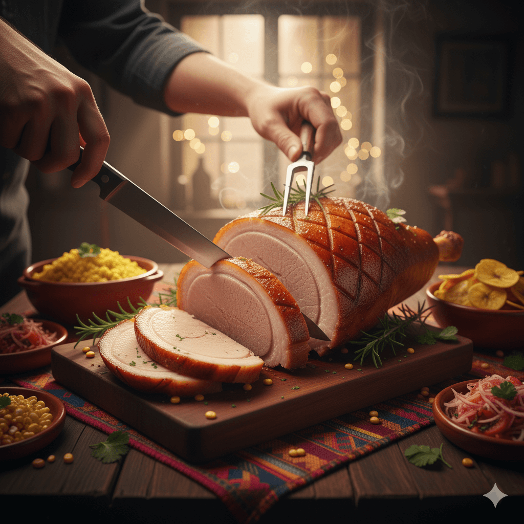 El rey de la mesa en las festividades. Esta pierna de cerdo se marina en un adobo rico en especias y cítricos, se hornea hasta que la carne esté tierna y la piel crujiente. Es un festín garantizado para cualquier reunión grande.