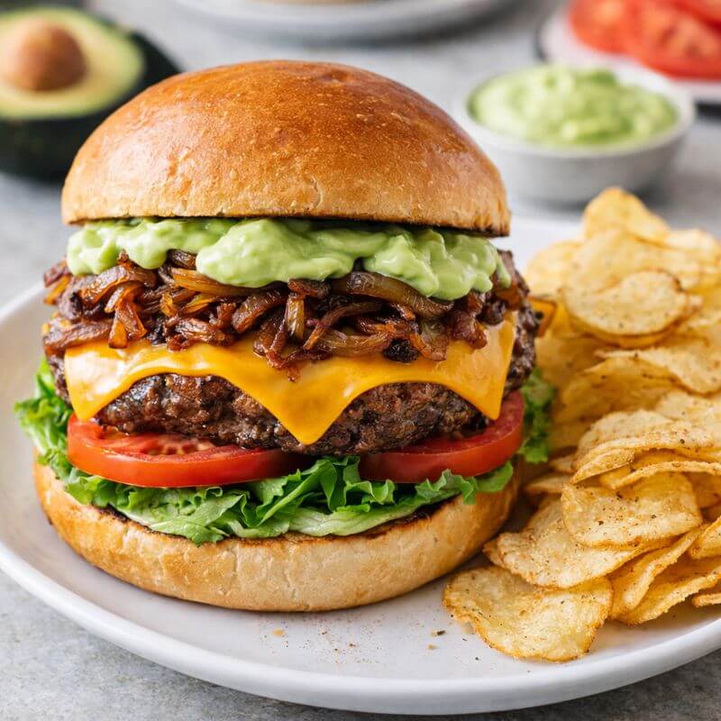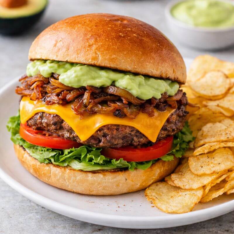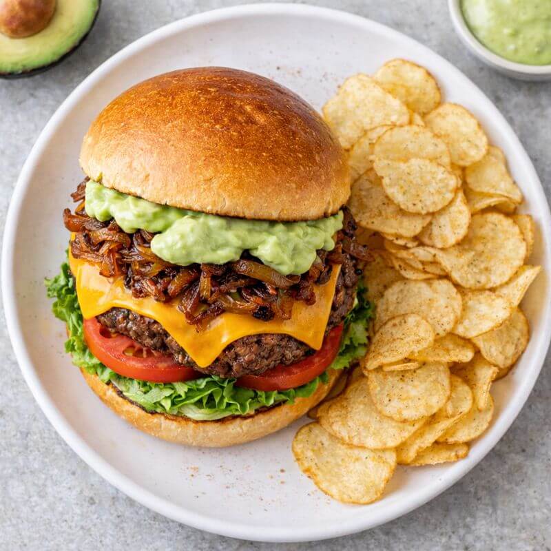 Para el armado, dorar el pan con un poco de mantequilla. Colocar la hamburguesa con el queso, agregar la lechuga, la cebolla grillada, el tomate y el alioli de aguacate. Servir acompañada de las papas fritas.
