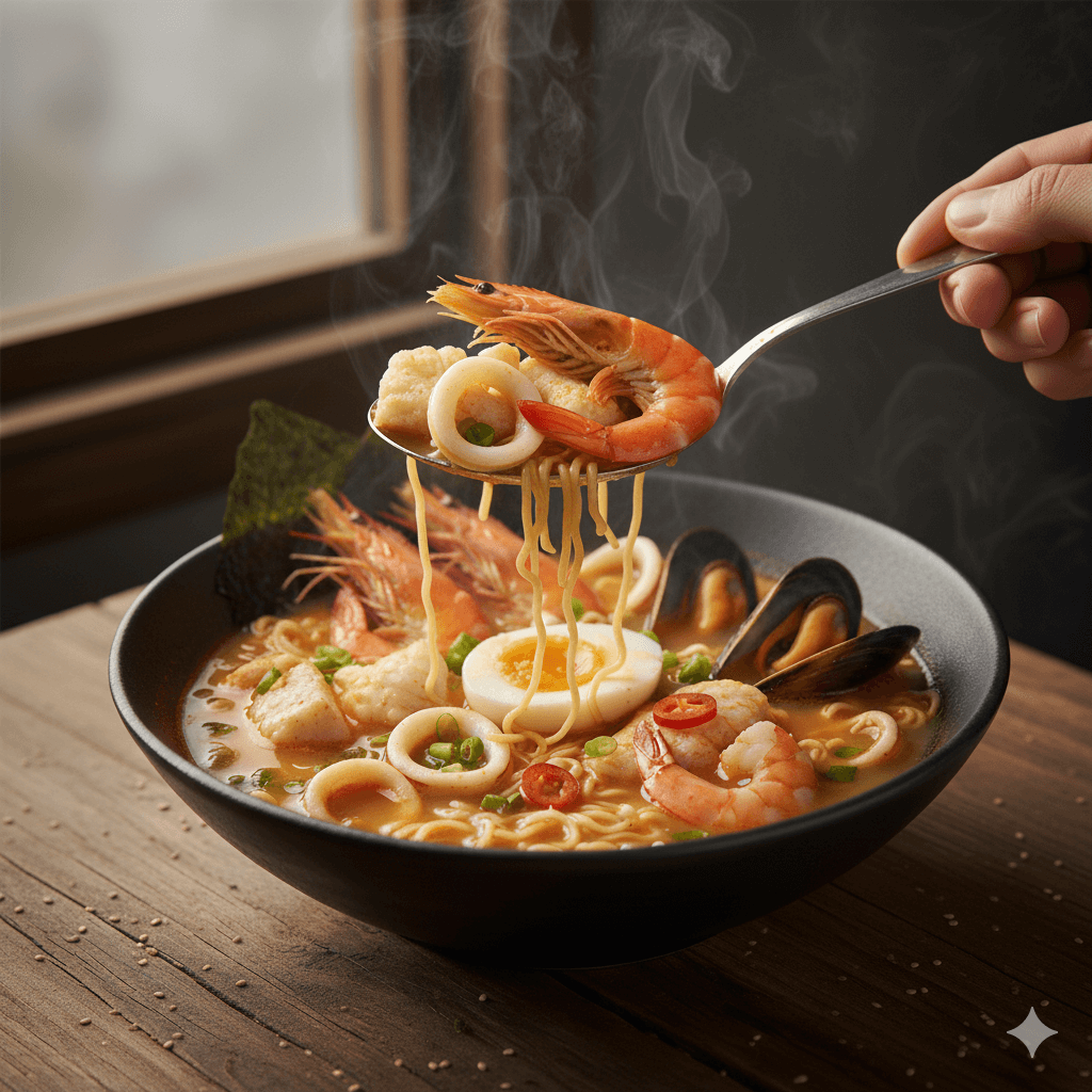 El plato de fideos japonés con un toque oceánico. Fideos sumergidos en un caldo sabroso y caliente, cargado de camarones, calamares y algas. Es un plato sustancioso, exótico y profundamente reconfortante.