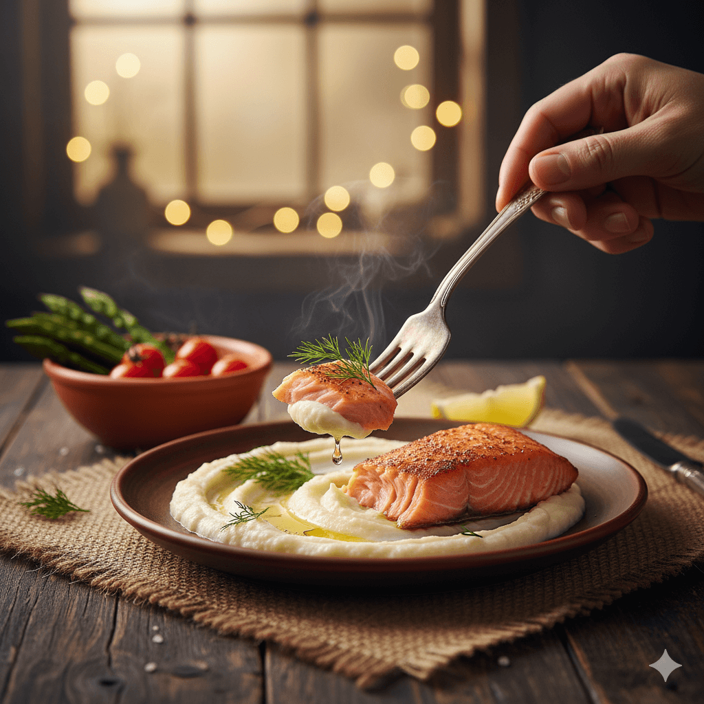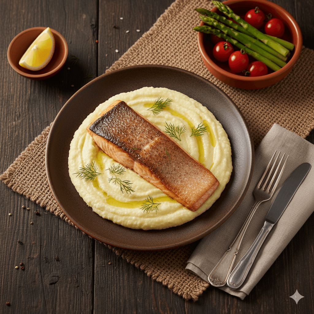 Un plato saludable, elegante y lleno de sabor. El salmón se cocina a la perfección, acompañado de un cremoso puré de coliflor que sustituye a la papa. Una opción nutritiva que te encantará.