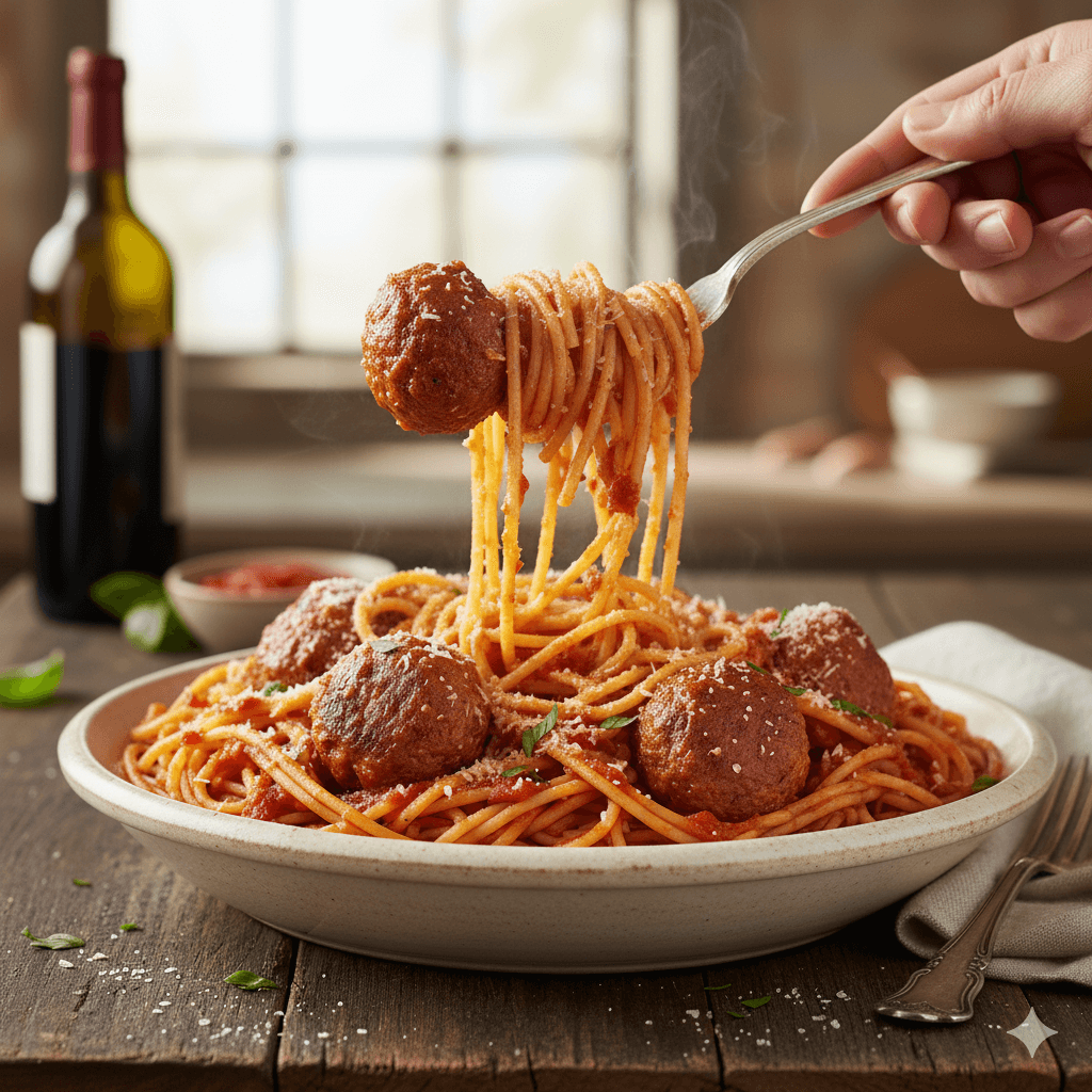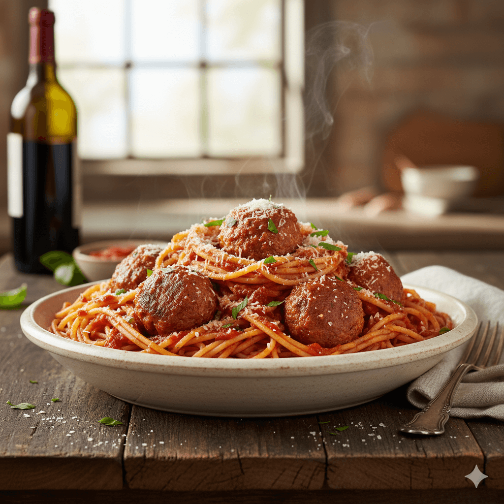 El plato de pasta favorito de todos. Spaghetti al dente cubiertos con una rica salsa de tomate casera y grandes albóndigas de carne jugosas. Un clásico de la cocina italoamericana.