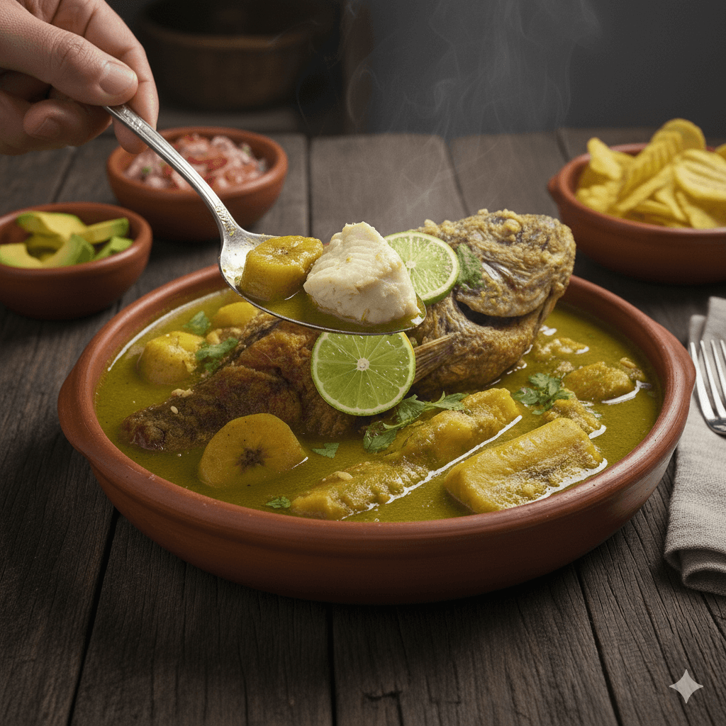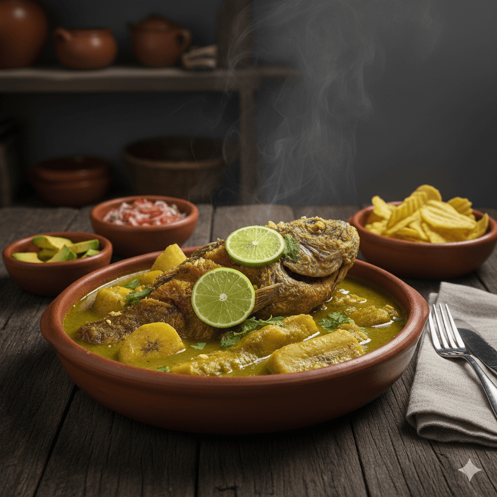 Pescado marinado y cocido al vapor en hojas de plátano con trozos de verde y yuca. Es un método de cocción que sella los jugos y sabores. Un plato muy sano y aromático.