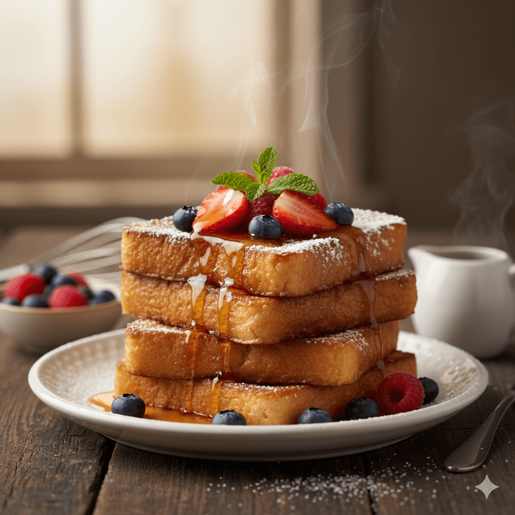 El desayuno dulce y clásico con pan brioche o de molde. Pan empapado en una mezcla de huevo y leche, dorado en mantequilla y servido con sirope y frutas. Un placer para el fin de semana.