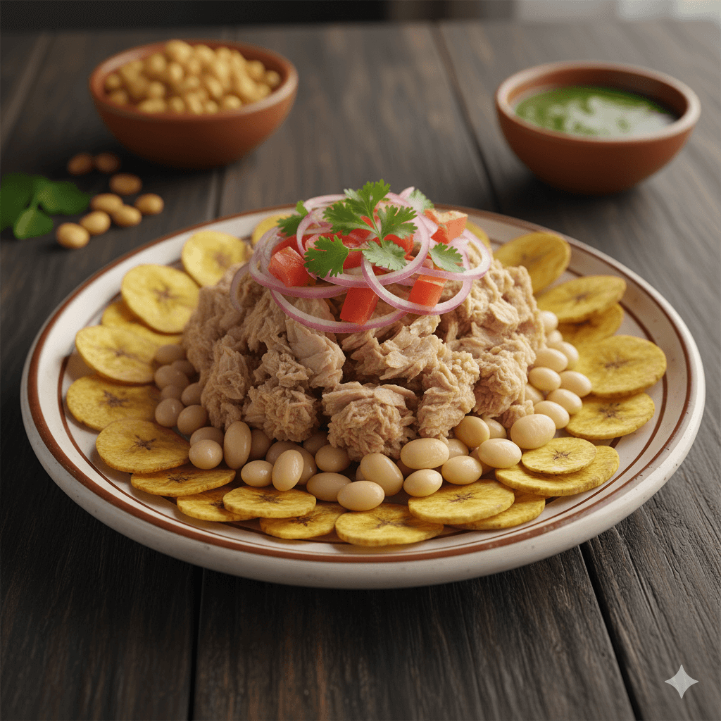 Un plato rústico y completo, perfecto para el viajero. Combina pescado enlatado (atún o sardina), cebolla encurtida, chifles (plátano frito) y canguil. Un plato rápido, nutritivo y delicioso.